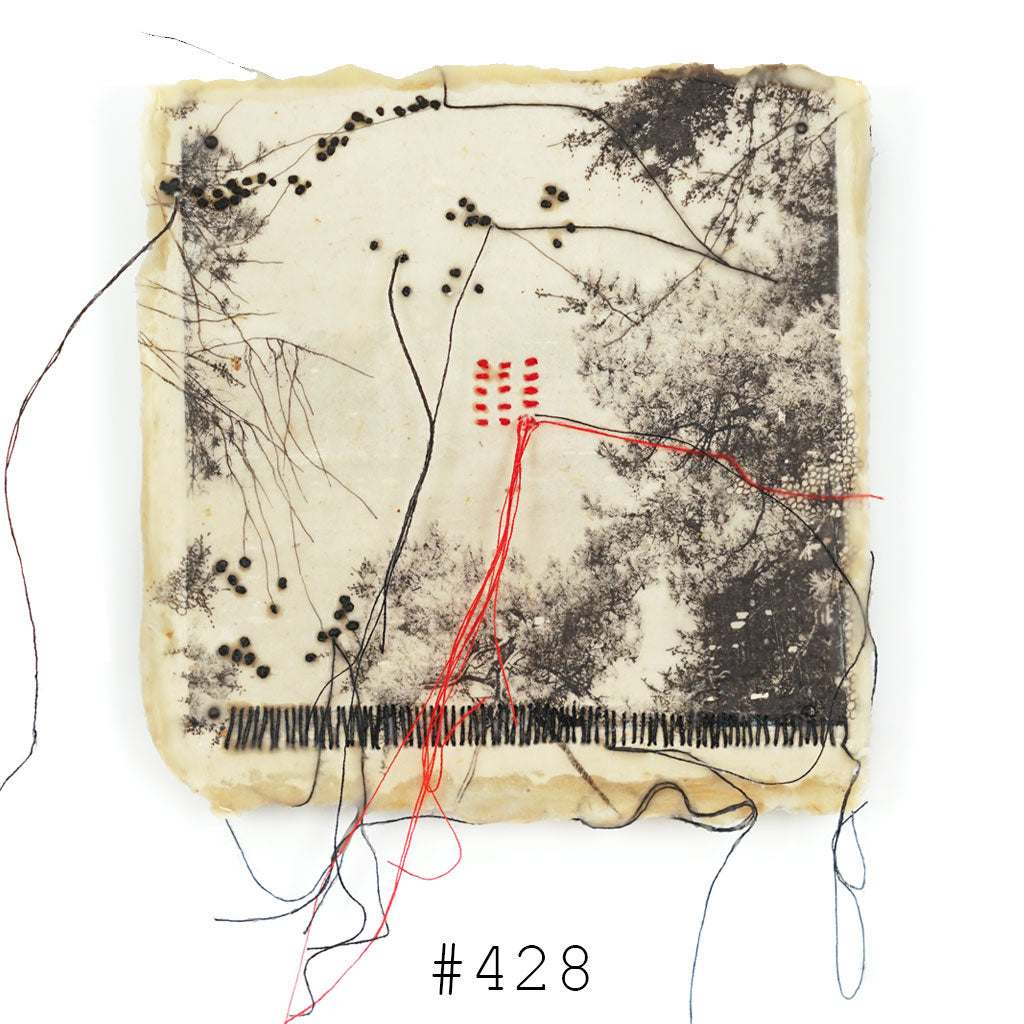 . the artwork is a photo transfer on hemp paper, hand embroidery, mounted on a wood panel, covered with beeswax, 13 x 13 cm